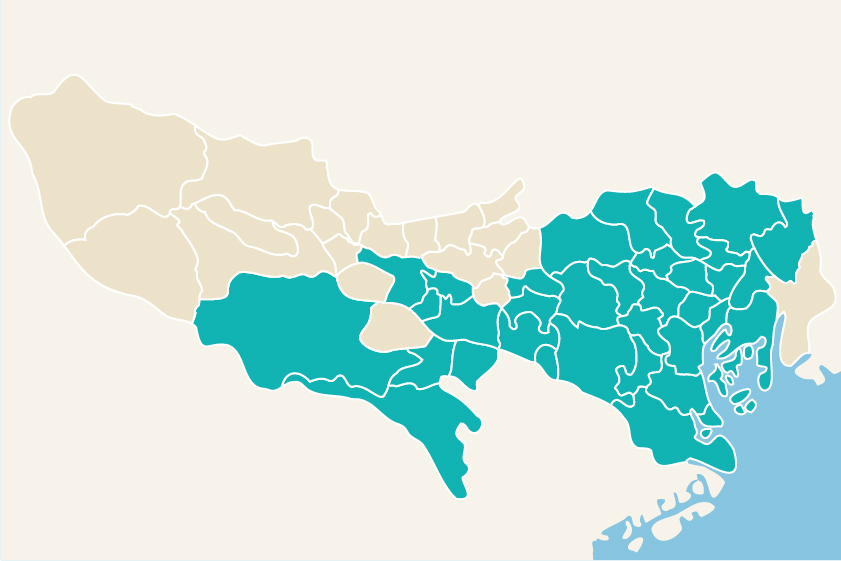 千代田区、中央区、港区、新宿区、渋谷区、品川区、目黒区、文京区、台東区、墨田区、江東区、大田区、世田谷区、中野区、杉並区、豊島区、北区、荒川区、板橋区、練馬区、足立区、葛飾区、立川市、国立市、国分寺市、府中市、武蔵野市、三鷹市、調布市、狛江市、町田市、多摩市、稲城市、八王子市(一部主要エリア)