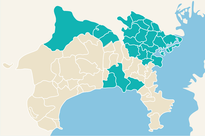 川崎市(川崎区、幸区、中原区、高津区、多摩区、宮前区、麻生区)横浜市(鶴見区、神奈川区、西区、中区、南区、保土ケ谷区、旭区、港北区、緑区、青葉区、都筑区)、相模原市(一部主要エリア)、藤沢市(一部主要エリア)、鎌倉市(一部主要エリア)、茅ヶ崎市(一部主要エリア)