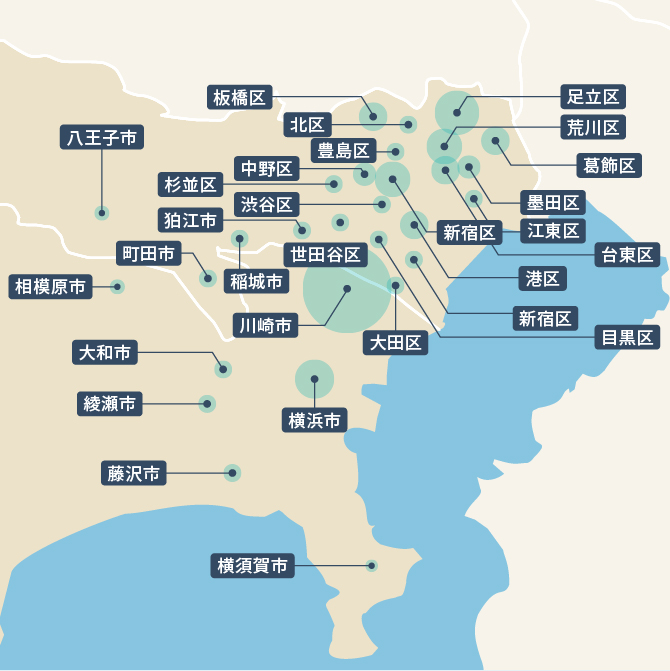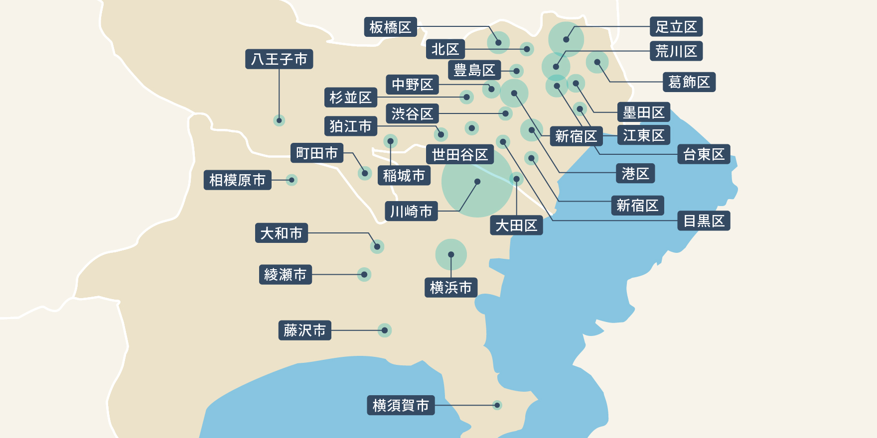 足立区 10件 荒川区 5件 新宿区 5件 板橋区 3件 台東区 3件 葛飾区 3件 港区 3件 墨田区 2件 中野区 2件 渋谷区 1件 目黒区 1件 -